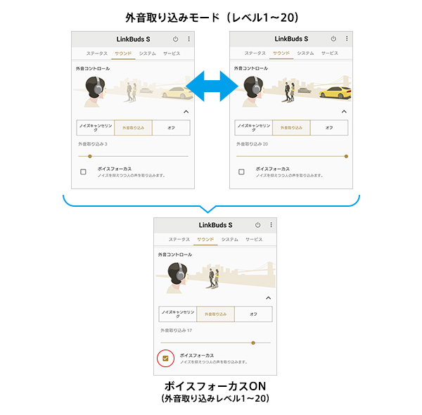 外音の取り込み方のレベルを20段階で調整可能。さらに、ボイスフォーカスをONにすることで、周囲の音を取り込みながらもノイズは低減し、人やアナウンス音のみを聞きやすくすることも可能です。自分の好きな外音取り込みのレベルに設定できるので、シーンに応じて快適に音楽を楽しむことができます。