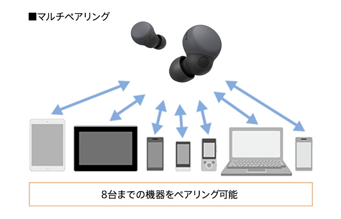 8台までの機器とペアリングできるマルチペアリングに対応。Androidでも、iPhoneでも、PCでも、よく使う機器と一度ペアリングしておけば、2回目からのBluetooth接続がかんたんになります。