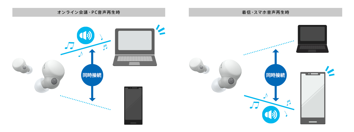 2台の機器と同時接続し、それぞれで通話も音楽も受信できるマルチポイント接続に対応。例えば、PCでオンライン会議を終了した後、スマートフォンで音楽再生を始めるだけで再生機器を切り替えられます。スマートフォンが電話を着信した際には自動でスマートフォンの通話に切り替わり、そのままハンズフリー通話をすることも可能。2台の機器でヘッドホンを使う場面で接続の切り替えがいらず、快適にご使用いただけます。また、LDACコーデックにも対応し、高音質のままマルチポイント接続可能です。
