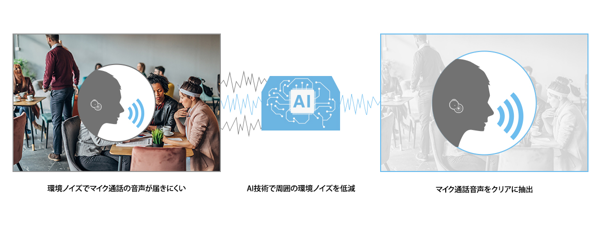 高度な音声信号処理を行う高精度ボイスピックアップテクノロジーにより、高い通話品質を実現。AIによる機械学習アルゴリズムで実現されたノイズリダクションシステムが周囲の環境ノイズを抑え、あなたの声をクリアに抽出します。