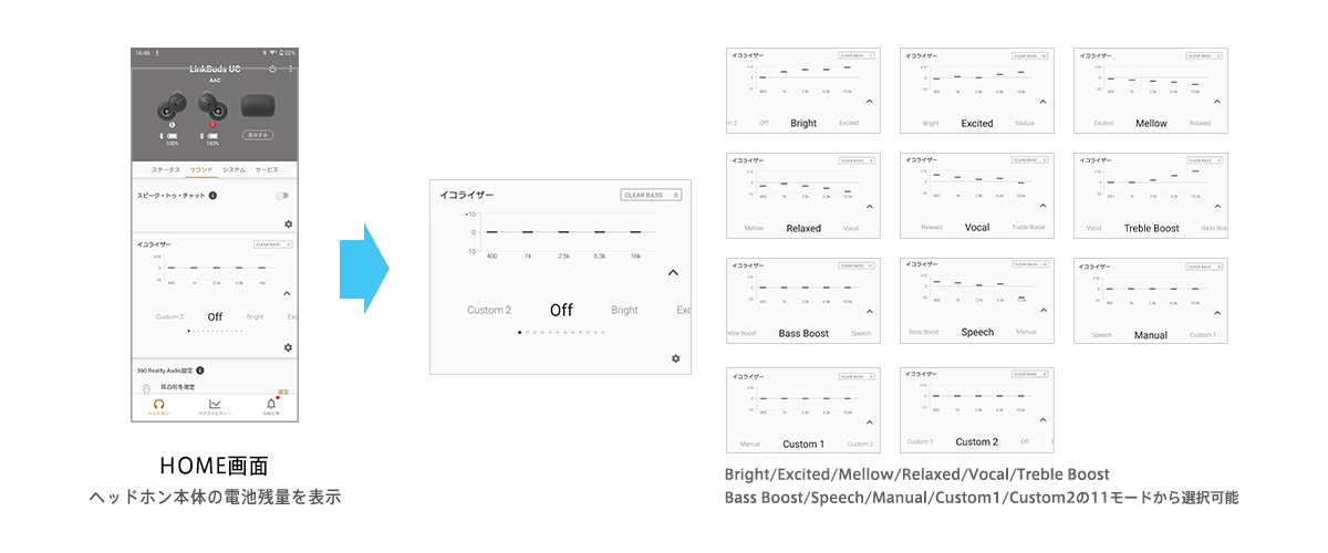 音質モードの切り替え、DSEEのON/OFF、立体音響の最適化設定、通知音と音声ガイダンスの言語の変更などの操作が可能です。