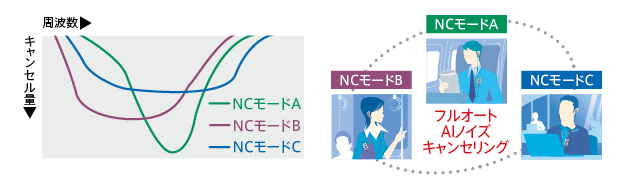 キャンセル量をコントロールするフィルター回路をデジタル化してソフトウェアで制御し、フィルター特性の切り替えを可能にしました。ヘッドホンが常に周囲の騒音を分析し、3つのノイズキャンセリングモードの中からその場に適したモードを自動で選択。騒音の変化に対応して自動でモードを変更してくれるので、常に最適な環境でクリアなリスニングを楽しめます。