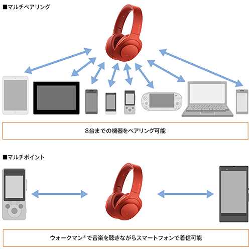 8台までの機器をペアリングできるマルチペアリングと、音楽再生機器(A2DPプロファイル)と通話機器(HFPまたはHSPプロファイル)、それぞれ1台ずつに同時接続できるマルチポイントに対応。ウォークマン(R)で音楽を聴きながらスマートフォンで着信できるのでスマートフォンとウォークマン(R)の2台持ちに便利です。
