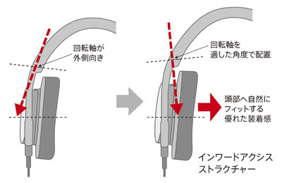 独自のハンガー構造を採用。ハウジングの回転軸を内側に向けることで装着安定性を向上しました。