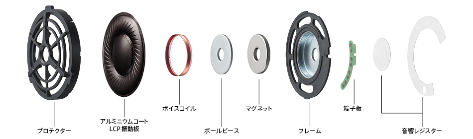 振動板材料として理想的な特性を持つLCP(液晶ポリマー)にアルミニウム薄膜をコーティング。LCPとアルミニウムの相互作用により全帯域で高くフラットな内部損失特性を実現し、色付けのないクリアな中高音を再生します。