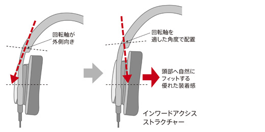 独自のハンガー構造を採用。ハウジングの回転軸を内側に向けることで装着安定性を向上しました。