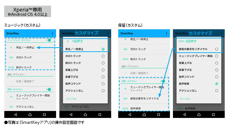 「SmartKeyアプリ」をGooglePlayストアからダウンロードすることで、マルチファンクションボタンによるリモコン操作をカスタマイズできます。ミュージック/通話/保留のカスタム画面から、ボタンを押す回数によってどの操作(再生/一時停止や応答/通話終了など)を行うかの設定が可能です。