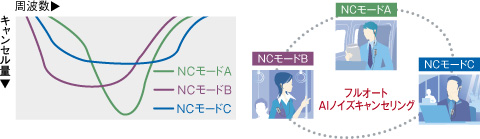 キャンセル量をコントロールするフィルター回路をデジタル化してソフトウェアで制御し、フィルター特性の切り替えを可能にしました。ヘッドホンが常に周囲の騒音を分析し、3つのノイズキャンセリングモードの中からその場に適したモードを自動で選択。騒音の変化に対応して自動でモードを変更してくれるので、常に最適な環境でクリアなリスニングを楽しめます。