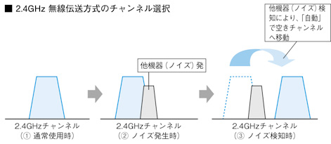使用中にも常時電波を確認し、電波妨害が起きる前に自動で空きチャンネルへ移動するため音が途切れません。