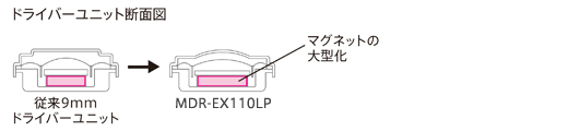 従来の9mmドライバーユニットと比べて総磁束を50%アップすることで、高感度・高音質化を実現しました。さらに、音の解像度を高め、クリアな中高音と重厚でパワフルな低音を再生する400kJ/m3高磁力ネオジウムマグネットを搭載。カラフルでコンパクトなボディから、バランスに優れた高音質サウンドを再生します。