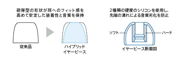 2種類の硬度のシリコンを組み合わせたハイブリッドイヤーピースを採用。芯の部分は硬い素材を用いることで音の通路の形状を保持し、先端の潰れによる音質劣化を防止。外側の部分は柔らかい素材を用いることで耳へのフィット感を向上。密閉度を高め、長時間でも快適な装着性を実現しました。