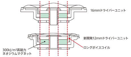 16mmドライバーユニットと同じサイズの300kJ/m3高磁力ネオジウムマグネットと、従来のボイスコイルよりも長く、マグネットとの接地を安定させるロングボイスコイルを採用。リニアリティの高い駆動系で、小型でありながら高感度で低歪な音響特性を実現します。