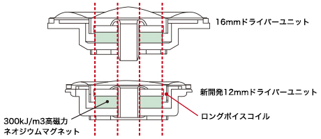 16mmドライバーユニットと同じサイズの360kJ/m3高磁力ネオジウムマグネットと、従来のボイスコイルよりも長く、マグネットとの接地を安定させるロングボイスコイルを採用。強力かつリニアリティの高い駆動系で、小型でありながら高感度で低歪な音響特性を実現します。