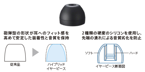 2種類の硬度のシリコンを組み合わせたハイブリッドイヤーピースを採用。芯の部分は硬い素材を用いることで音の通路の形状を保持し、先端の潰れによる音質劣化を防止。外側の部分は柔らかい素材を用いることで耳へのフィット感を向上。密閉度を高め、長時間でも快適な装着性を実現します。