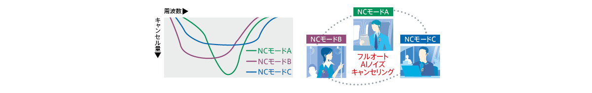 キャンセル量をコントロールするフィルター回路をデジタル化してソフトウェアで制御し、フィルター特性の切り替えを可能にしました。ヘッドホンが常に周囲の騒音を分析し、3つのノイズキャンセリングモードの中からその場に適したモードを自動で選択。騒音の変化に対応して自動でモードを変更してくれるので、常に最適な環境でクリアなリスニングを楽しめます。