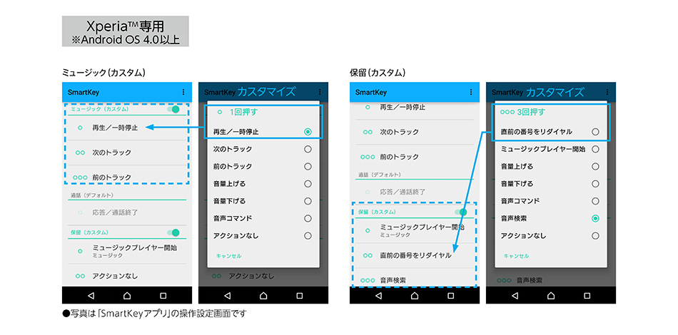 「SmartKeyアプリ」をGooglePlayストアからダウンロードすることで、マルチファンクションボタンによるリモコン操作をカスタマイズできます。ミュージック/通話/保留のカスタム画面から、ボタンを押す回数によってどの操作(再生/一時停止や応答/通話終了など)を行うかの設定が可能です。