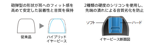 2種類の硬度のシリコンを組み合わせたハイブリッドイヤーピースを採用。芯の部分は硬い素材を用いることで音の通路の形状を保持し、先端の潰れによる音質劣化を防止。外側の部分は柔らかい素材を用いることで耳へのフィット感を向上。密閉度を高め、長時間でも快適な装着性を実現しました。