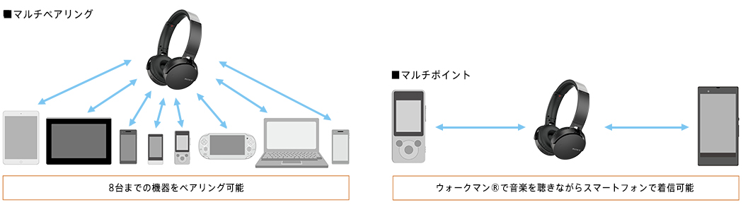 8台までの機器とペアリングできるマルチペアリングに対応。よく使う機器と一度ペアリングしておけば、2回目以降のBluetooth接続が簡単になります。また、音楽再生機器(A2DPプロファイル)と通話機器(HFPまたはHSPプロファイル)、それぞれ1台ずつに同時接続できるマルチポイントにも対応。例えばウォークマンで音楽を聴いている最中に、スマートフォンにかかってきた電話を着信してそのままハンズフリー通話をすることも可能。スマートフォンとウォークマンの2台持ちに便利です。