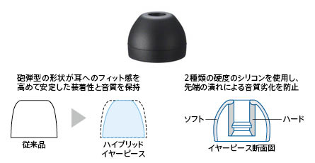 2種類の硬度のシリコンを組み合わせたハイブリッドイヤーピースを採用。芯の部分は硬い素材を用いることで音の通路の形状を保持し、先端の潰れによる音質劣化を防止。外側の部分は柔らかい素材を用いることで耳へのフィット感を向上。密閉度を高め、長時間でも快適な装着性を実現します。