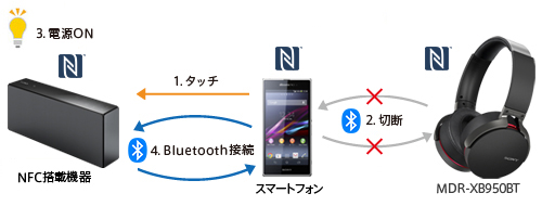 NFC搭載スマートフォンやおサイフケータイ(R)対応Android(TM)搭載スマートフォンなどをヘッドホンにタッチすると電源がONになり、Bluetooth接続が完了します。