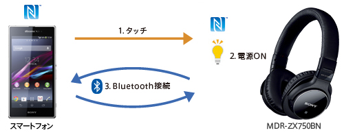 NFC搭載スマートフォンやおサイフケータイ対応Android搭載スマートフォンなどをヘッドホンにタッチすると電源がONになり、Bluetooth接続が完了します。