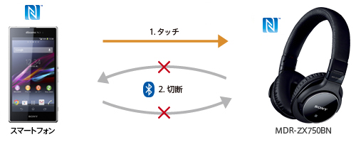 Bluetooth接続中のNFC搭載スマートフォンやおサイフケータイ対応Android搭載スマートフォンなどをヘッドホンにタッチすると、Bluetooth接続を切断します。