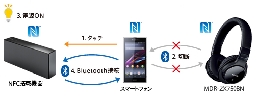 ヘッドホンとBluetooth接続中のNFC搭載スマートフォンなどを、ヘッドホン以外のNFC搭載機器にタッチすると、ヘッドホンとのBluetooth接続を切断し、Bluetooth接続の切り替えが完了します。