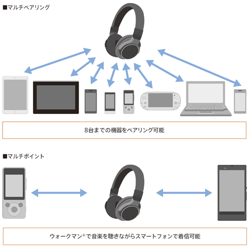 8台までの機器をペアリングできるマルチペアリングと、音楽再生機器(A2DPプロファイル)と通話機器(HFPまたはHSPプロファイル)、それぞれ1台ずつに同時接続できるマルチポイントに対応。ウォークマンで音楽を聴きながらスマートフォンで着信できるのでスマートフォンとウォークマンの2台持ちに便利です。
