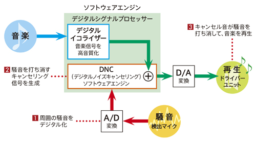 ヘッドホンに内蔵されたマイクで拾った騒音をデジタル化して、DNC(デジタルノイズキャンセリング)ソフトウェアエンジンにおいてその騒音を打ち消す効果のある逆位相の音を発生させます。音楽信号はデジタルイコライザーで高音質化。従来のアナログノイズキャンセリング方式に比べて、より静かな環境での音楽再生が可能です。
