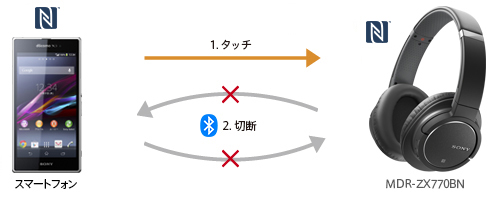 Bluetooth接続中のNFC搭載スマートフォンやおサイフケータイ(R)対応Android(TM)搭載スマートフォンなどをヘッドホンにタッチすると、Bluetooth接続を切断します。