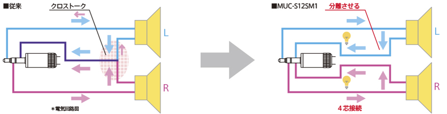グラウンドを分離した4芯構成により、左右のセパレーションを改善。音の広がりと引き締まった低音を実現します。