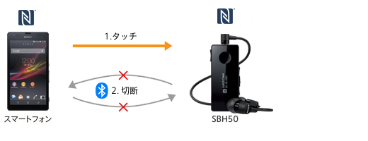 Bluetooth接続中のNFC搭載のスマートフォンをSBH50にタッチすると、Bluetooth接続を切断します。