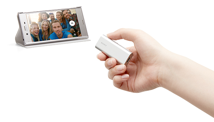 スマートフォンのカメラをリモートで起動し、さらに撮影もできます(*1)。手振れを気にする必要もなくなり、また友人と一緒に撮影するときに便利です。カメラキーを長押しすると、カメラアプリが起動します(*2)。続けて、カメラキーを短押しすれば撮影できます。カメラアプリ起動時に、2回短押しすると、カウントダウンが始まりセルフタイマーが使えます。