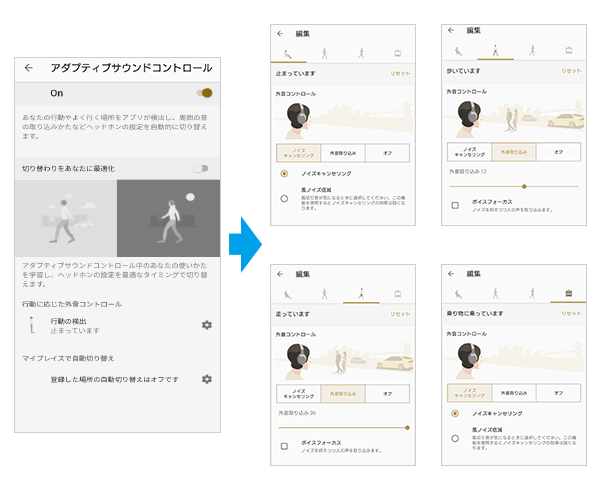 接続しているスマートフォンの加速度センサーにより、止まっている時・歩いている時・走っている時・乗り物に乗っている時の4パターンの行動を検出します。ユーザーの行動に合わせて、あらかじめ各パターンで設定したノイズキャンセリング・外音取り込み設定に、自動で切り替えてくれます。