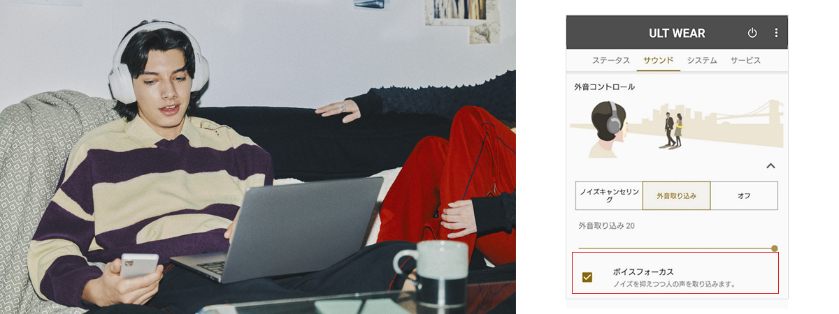 信号処理の外音取り込み量を増やすことで、音楽を楽しみながら、より自然に周りの音が聞こえます。「ボイスフォーカス」をONにすれば、周囲の音を取り込みながらもノイズを低減できるので、人の声やアナウンス音だけを聞きやすくできます。(*)