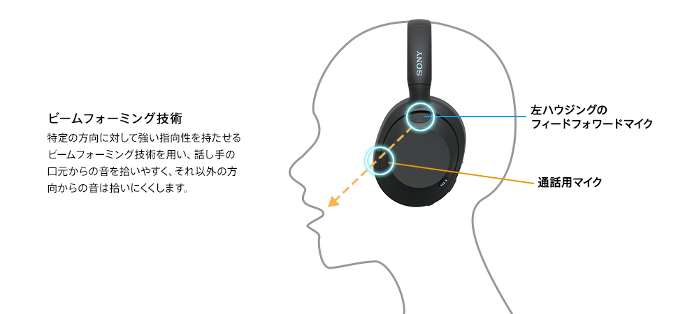 WH-1000XM4同様のデュアルノイズセンサーテクノロジー採用で、より高性能なノイズキャンセリングを実現しました。左右ハウジングに搭載した計4つのマイク(フィードフォワードマイク×2、フィードバックマイク×2)を最適に制御し、騒音を打ち消す効果のある逆位相の音を高精度に生成します。