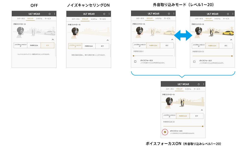 ノイズキャンセリングのON/OFFや、外音取り込みのレベルを20段階で調整できます。お好きなレベルに設定し、シーンに応じて、より快適に音楽を楽しめます。