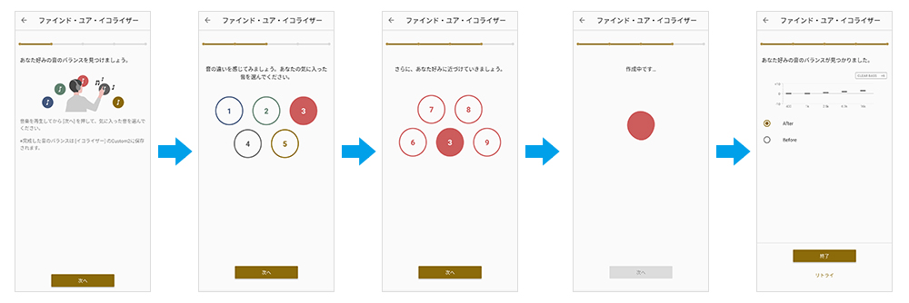 2つの画面でお好みの音質を選択するだけで、イコライザーを細かく調整したような音質設定ができます。直観的な操作で簡単に調整でき、設定された音質はイコライザーの「Custom」に登録されます。