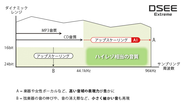 ストリーミングなどの圧縮音源を膨大な楽曲データを学習しているAI(人工知能)技術により、リアルタイムに分析。楽曲のジャンルや楽器などの情景に合わせて最適にハイレゾ級(*)の高音質にアップスケーリングします。圧縮により失われた音源本来の周波数特性をより高精度に再現することで、臨場感あふれる高音質をお楽しみいただけます。AI技術の最先端であるディープ・ニューラル・ネットワーク(DNN)技術を駆使して再生している音の解析を行い、ボーカルに対してはボーカル向けのアップスケーリングを、打楽器に対しては打楽器向けのアップスケーリングをリアルタイムに切り換えながら適用できるようにしています。これによりボーカルの声を美しく響かせながら、同時に打楽器の迫力ある立ち上がりを再現します。