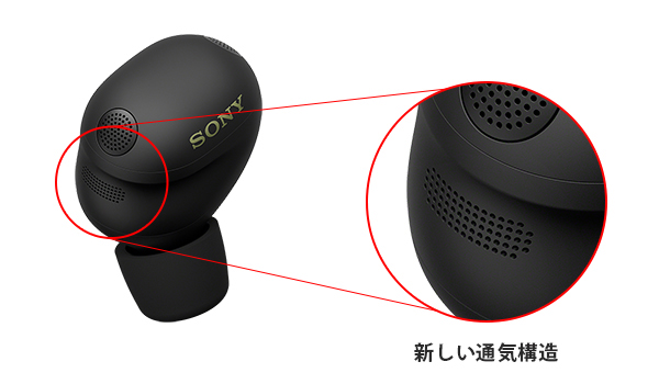 新しい通気構造によりイヤホン本体から耳への通気量が増えたことで、自らの足音や咀嚼音などの体内ノイズが大幅に減少しました。これはノイズキャンセリングのパッシブ遮音のバランス調整にも関連しています。