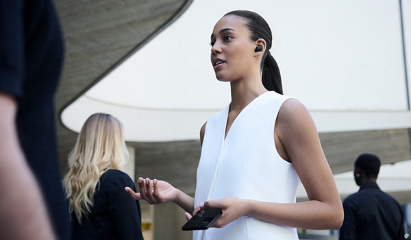片側2つのマイクと骨伝導センサーで収音した声をAIノイズリダクションにより装着者の声とそれ以外のノイズを高精度に分離し、処理します。それにより騒がしい環境だけでなく、オフィスなど周囲の会話が多く聞こえる環境下でも発話者の声だけが届くクリアな通話を実現します。
