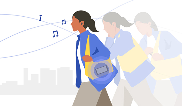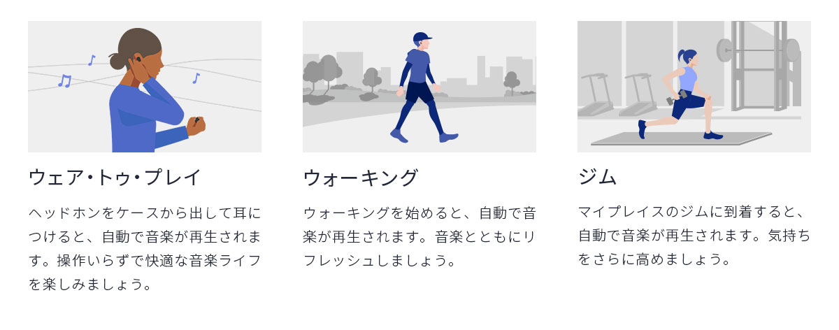 「Scene-based Listening」(シーンベースドリスニング)はヘッドホンは行動パターン(止まっています/歩いています/走っています/乗り物に乗っています)やよく行く場所(自宅/職場/学校/駅/バス停/ジム/その他)などユーザーの行動を検知し、周囲の環境や行動に適したタイミングで音楽や情報を自動でお届けします。例えば、ヘッドホンを装着するだけでスマートフォンを操作することなく、自動で音楽を聞くことができます。また、ウォーキングやランニング、ジムなどのシーンを感知し、最適な音楽を提供します。音楽だけでなく、行動に合わせてノイズキャンセリングと外音取り込みを自動で切り替えたり、音声通知で時刻や天気などの情報を受け取ることもできます。自動再生するシーンや連携する音楽、音声通知の情報は事前にカスタマイズできます。