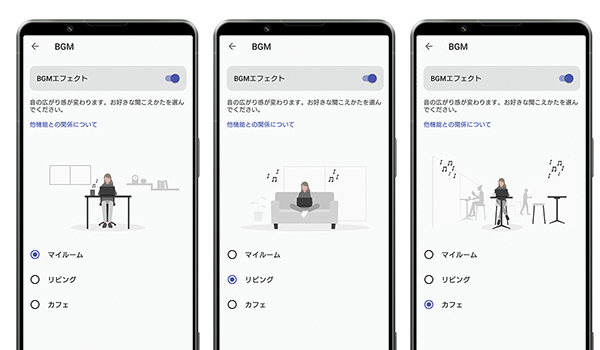 音楽をはじめとしたコンテンツ音が、空間で流れているBGMのように聞こえる機能です。音源が遠くから聞こえるように感じられるため、別の作業をしながらのリスニングに適しています。