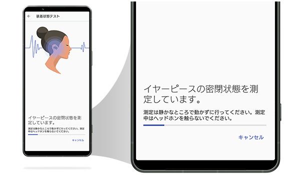 イヤホンが正しく耳に装着されているか判定する機能と、イヤーピースの気密性を測定しサイズが適正かを判定する機能があります。適正なサイズのイヤーピースを使って耳に正しく装着されていないとノイズキャンセリングなどの効果を十分に得られない場合があるため、自分自身では確認しづらい耳の状態も自動撮影機能によって一人で確認することができます。センサーによる自動判定と写真でのセルフチェックの2段階があります。