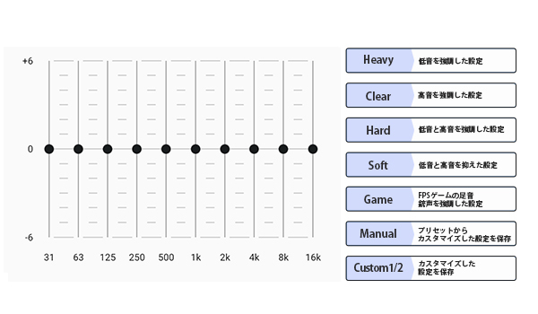 イコライザーが従来の5バンドから10バンドに増え、より好みに応じたカスタマイズが可能になりました。またプリセット「Heavy」や「Clear」など5種類から選択が可能です。さらにINZONE向けに開発されたテクノロジーを活用し、ライトにゲームを楽しむユーザー向けに「Game」のプリセットを新たに追加。音楽以外のコンテンツでも最適なプリセットを用意しています。