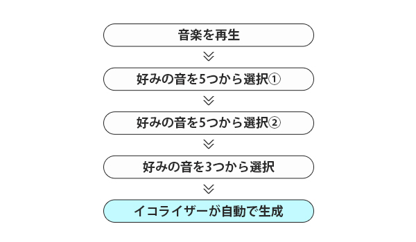 3つの画面でお好みの音質を選択するだけでイコライザーを細かく調整したような好みの音質設定が可能です。直観的な操作で簡単に自分にあった好みの音に調整可能で、設定された音質はイコライザーの「custom」に登録できます。