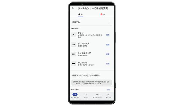 本体のタップ操作を左右それぞれ変更することができます。またWF-1000XM6では「カスタム」を選択いただくと「タップ」、「ダブルタップ」、「トリプルタップ」、「押し続ける」の操作ごとに自由に設定することが可能です。