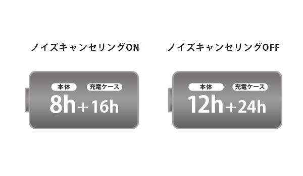 ノイズキャンセリングONの場合は本体8時間バッテリーと、充電ケース2回充電で、最長24時間バッテリーが持続します。さらに、ノイズキャンセリングOFFの場合は本体のみで12時間、付属のケース2回充電で、最長36時間バッテリーが持続します。(*)