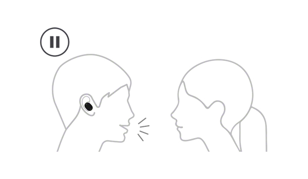 音楽を聴いている最中でも、話したいときに声を発するだけで音楽のボリュームが下がり、外音取り込みモードに切り替え、手を使うことなくイヤホンをしたまま会話が始められます。イヤホンが装着者の声を振動検出により周囲の音から区別・認識し、「スピーク・トゥ・チャット」が起動します。両手がふさがっている場合でも、イヤホンを外すことなくすぐに会話ができます。