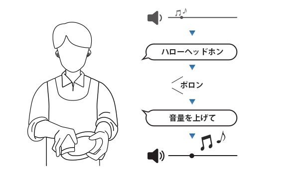 「ハローヘッドホン」のあとに以下の音声コマンドを発すると、ヘッドホンを操作できます。また「アシスタント」と発するとモバイル機器の音声アシスト機能が起動し、アラームやタイマーの設定などが可能。